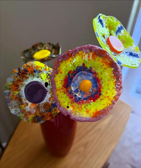 My frit blossoms are my newest Garden Art. They can be used in Outdoor Pots, or for adding a little color to your Indoors, by adding them to your potted house plants. Or just put them in a vase, they'll never dry up!